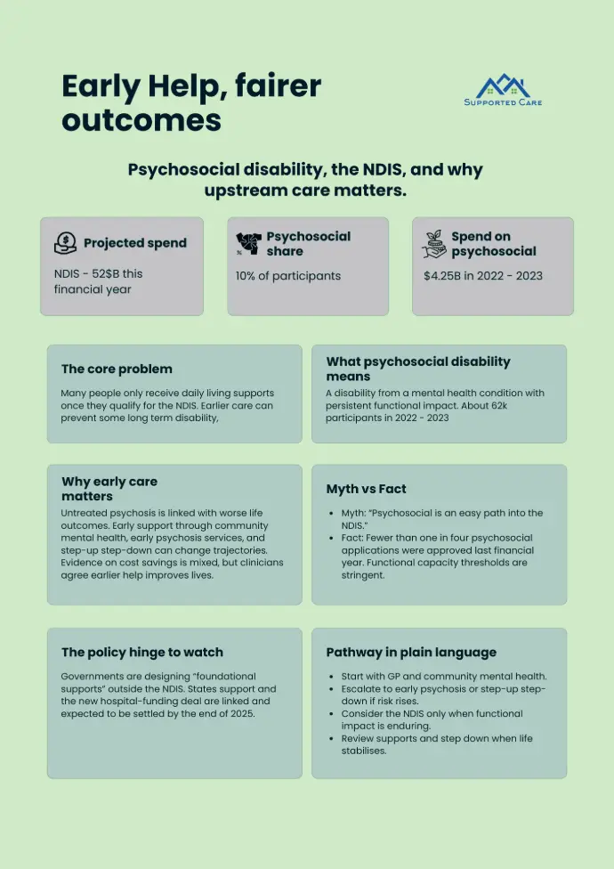 For families, referrers, and frontline workers, the practical takeaway is simple. Start early with community mental-health supports where available, escalate to specialist early-psychosis or step-up step-down services when risk rises, and consider the NDIS only when functional impact is enduring. This aligns with the ABC’s lived-experience vignette and the clinicians it quotes, while acknowledging that many people will still need disability-level supports to live well.